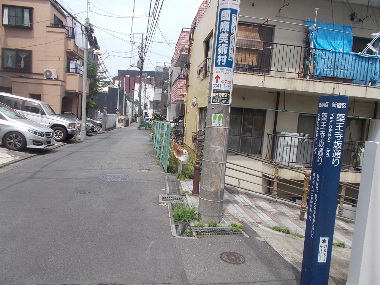 この薬王寺坂は地下鉄都営大江戸線牛込柳町駅から南に10分程度の場所にあります。外苑東通りから西の上がる坂です。かつてその登り口に薬王寺という寺があったのですが今はないです。坂の通りにはいくつかの寺が今も残っています。