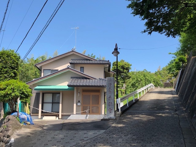 引地川を、引地橋(藤沢側)から上流に向かって歩いていると、「往生山・称名院 浄土宗本願寺」と書かれた柱が、坂の下に立っています。この坂を上った先が広場のようになっていて、そこに本堂と住宅を兼ねたような建物がありました。