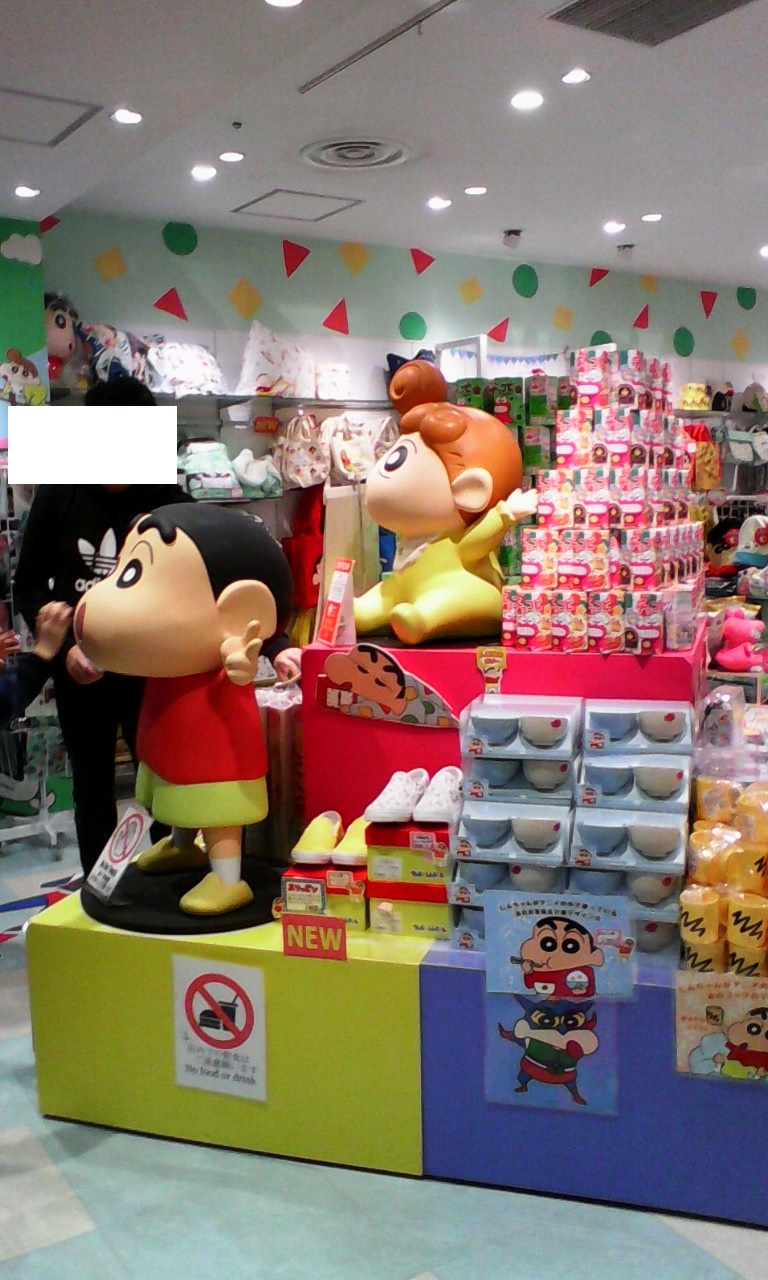 (アニメの中でしんちゃんが使ってるのと同じマグカップやお茶碗など、こだわりの品も多いです。店先には大きなしんちゃんの人形があり、記念撮影にもオススメでしょう)