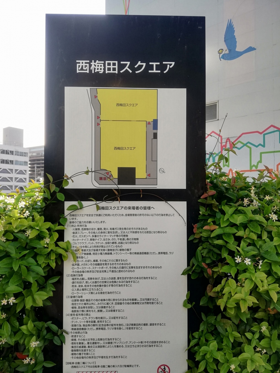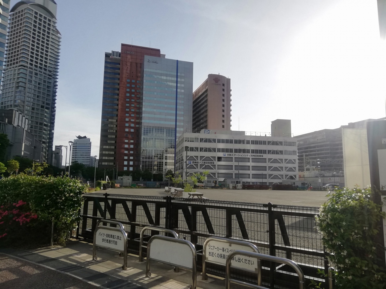 大阪中央郵便局の跡地です。以後、跡地の暫定利用策として、大型のビアガーデン的なイベントが行われたり、2017年12月~2019年8月までは、「よしもと西梅田劇場」がありました。ただ、今現在は何も活用されていない様に見える土地で、ベンチがあるだけの場所となっています。大阪駅の真横なのに、勿体無いですよね。