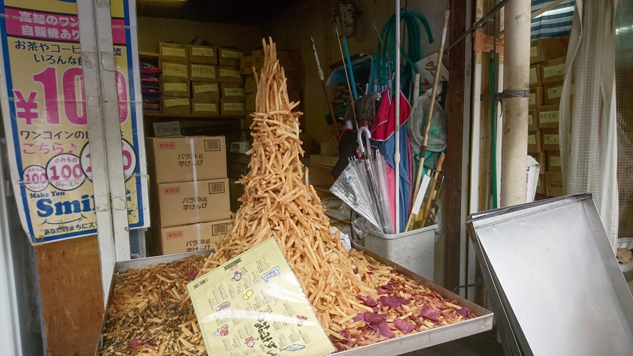 ひろめ市場にあるお店です。芋ケンピが有名です。芋ケンピは高知の名物。サツマイモをスティック状に切ったものを上げて砂糖を絡めた日本に昔からあるお菓子です。シンプルな味ですが、これが意外としつこくなく食べ飽きません。店先には、この芋ケンピがタワーのごとく積まれていて、その姿に引き込まれ、つい買ってしまいました。少量しか買わなかったので、あっという間に食べ終わりもう少し買えばよかったと後悔しました。それくらいおいしかったですく。