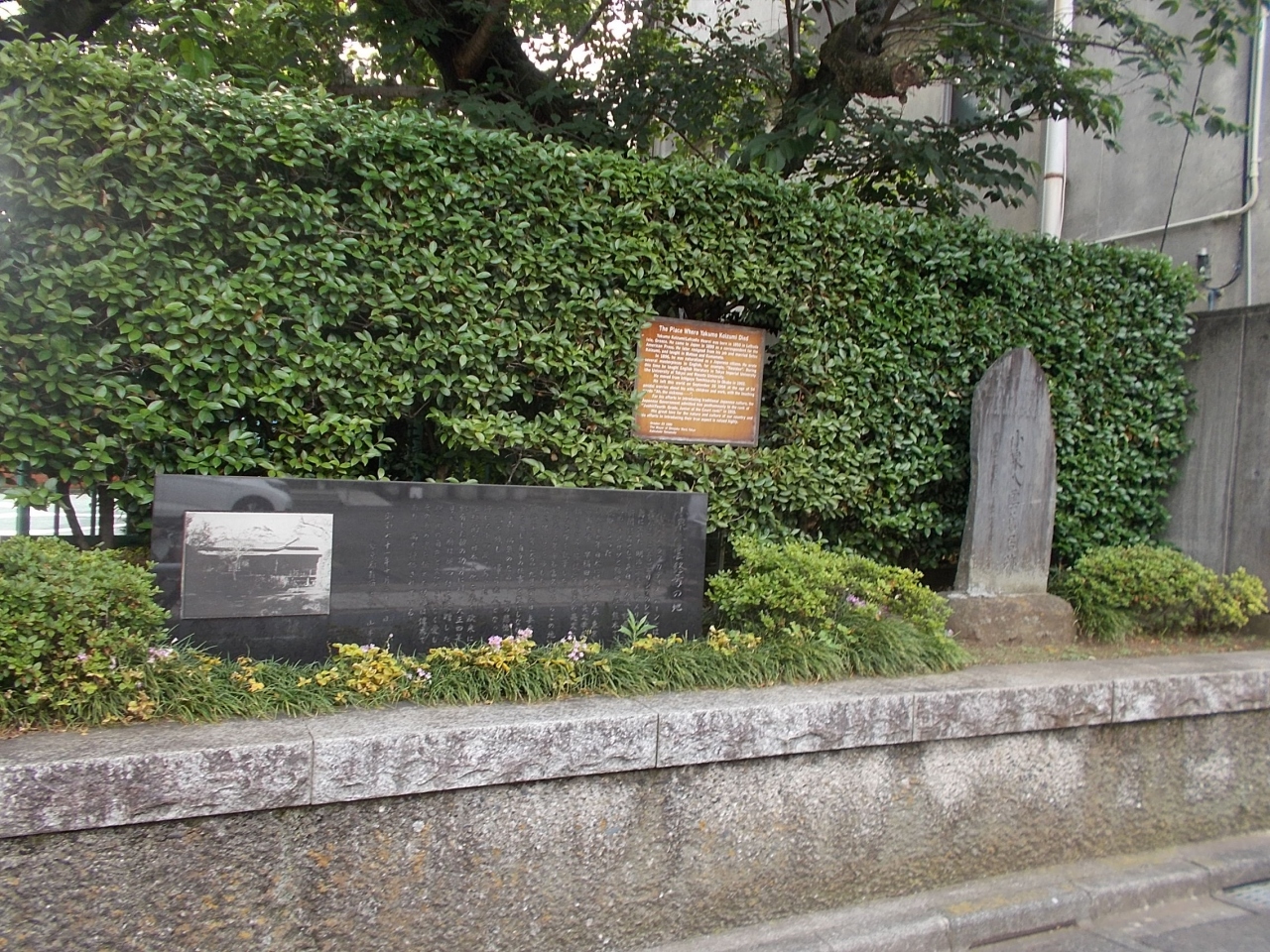 この小泉八雲終焉の地は地下鉄都営大江戸線東新宿駅から西に5分程度の場所にあります。この場所で晩年を生活しなくなりました。その場所に記念碑がたてられています。晩年過ごした住居の写真も刻まれています。近くに記念公園がつくられています。