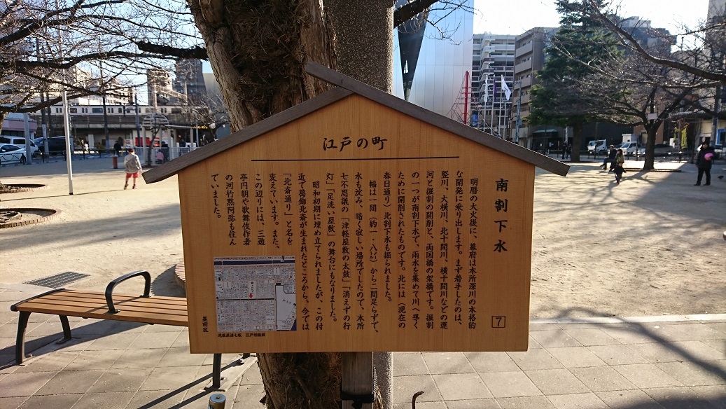 墨田区亀沢2丁目の緑町公園に南割下水の説明板が立っています。現代では緑町公園前を通る北斎通りが通っていますが、かつて南割下水という水路があり、江戸の町の排水の重要な役割を担っていたそうです。現在その面影はありません。