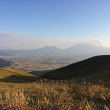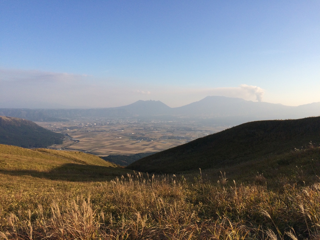 レンタカーで大観峰まで上がっていくと、遠くの阿蘇五岳から噴火の煙がふいているのや、一面の畑も見えました。秋だったので、どれも茶色い秋の景色でしたが、ススキの葉が太陽の光を反射して、黄金色に輝いていました。
