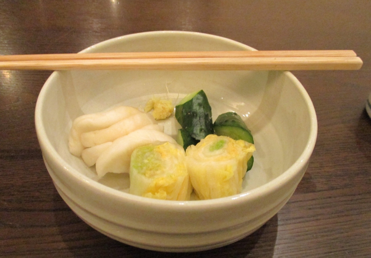 味噌煮込みうどんが出来るまでに、お新香(白菜、胡瓜、大根)が運ばれてきて、味噌煮込みうどんが出来るまでのお口凌ぎで食べました。