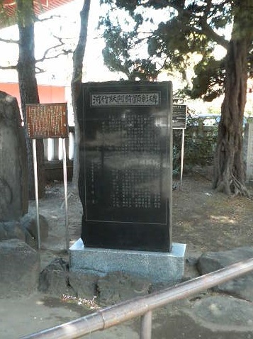 長方形のきれいな御影石の石碑で、説明によると、河竹黙阿弥は江戸時代~明治時代に活躍した歌舞伎の狂言作者で、神社の近く(正智院)に住んでいたとのこと。
