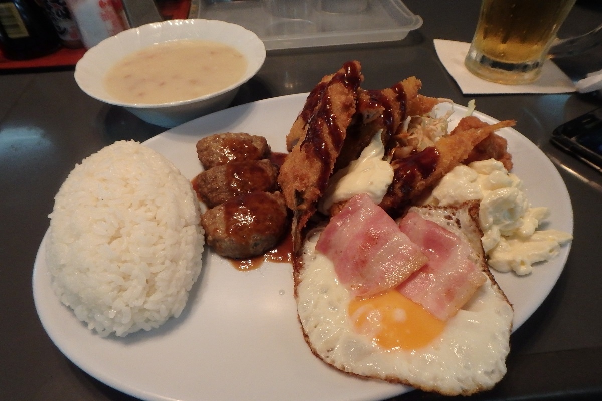 店奥にある券売機で食券を買ってテーブルへ。まずは生ビール....ちょっと苦手なジョッキを凍らせるスタイルで出てきたが外に居た時間が多かったのでありがたく。その後スープが出てきて、しばらくしてAランチメインのプレートが。ミニハンバーグにエビフライ、カツ、目玉焼きといろいろのって....そう、まるでお子さまランチの様相。こういうのに弱いんだよなぁ。ボリュームも味も満足でした。