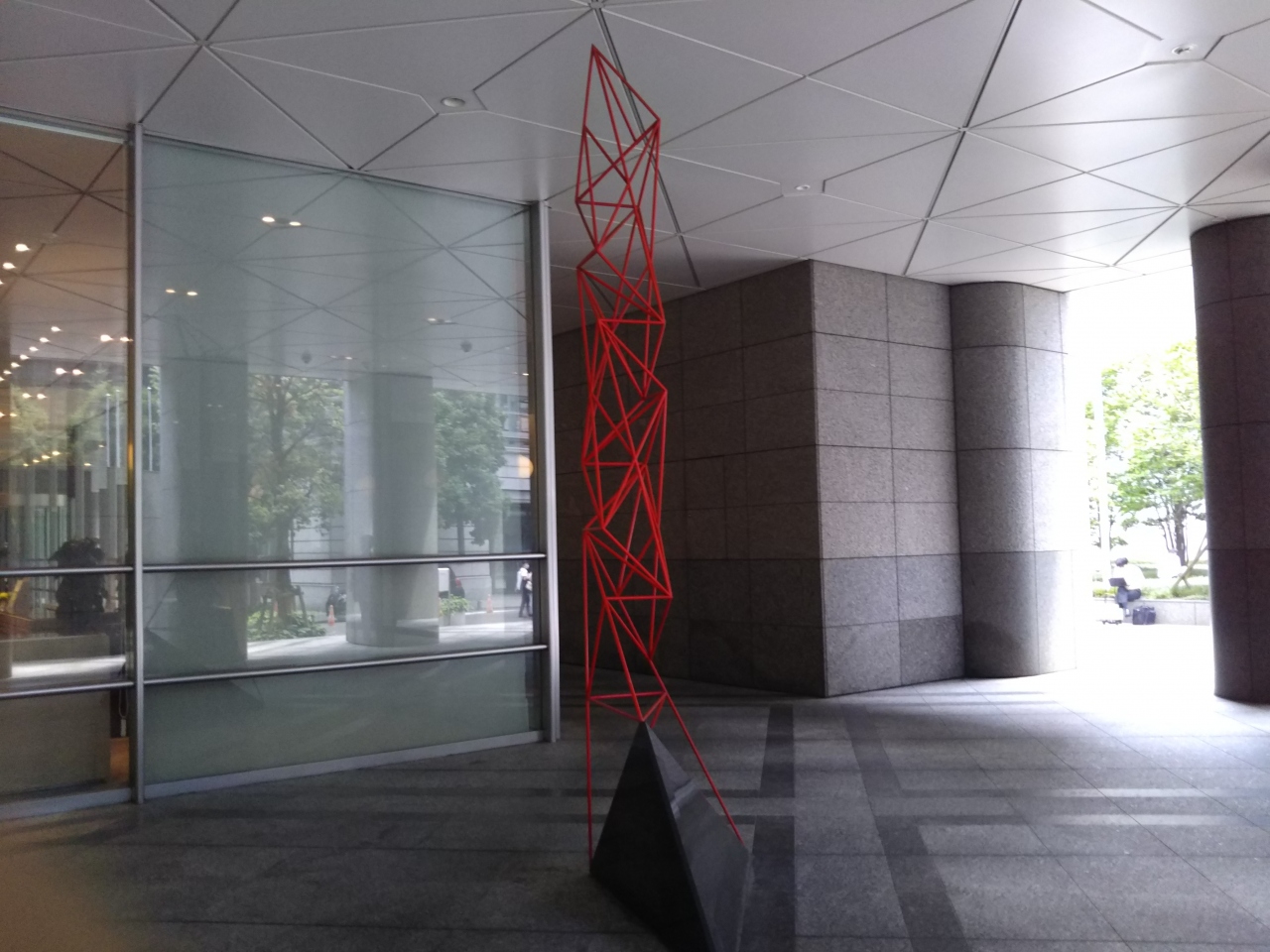 アーバンネット大手町ビルの1階に立つ赤い幾何学模様を組み合わせたようなモニュメント。