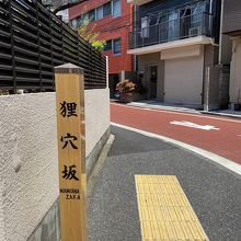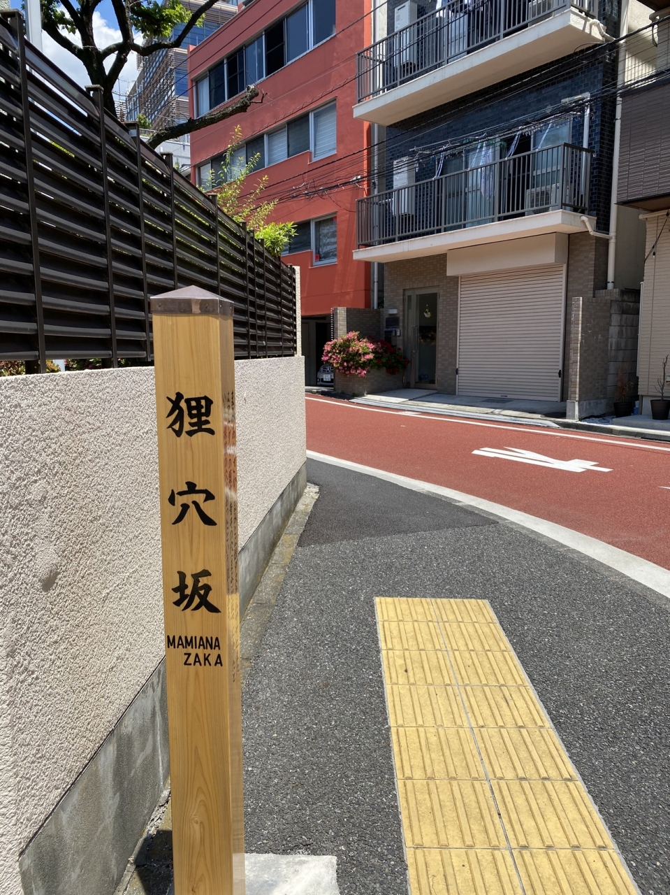 狸の穴と書いて、まみあなと読みます。建てられた標識の説明文には、まみとは雌ダヌキ・またはアナグマの類とありました。で、坂の名前の由来は、昔、その穴が坂下にあったとのこと。なんともシンプルというか、面白いというか。この辺りは比較的閑静でお店などは見当たりません。そのまま坂を上ると表通りにぶつかります。一方、麻布通り方向を目指すと、ちょっと浮世離れした永坂町を通る事となります。