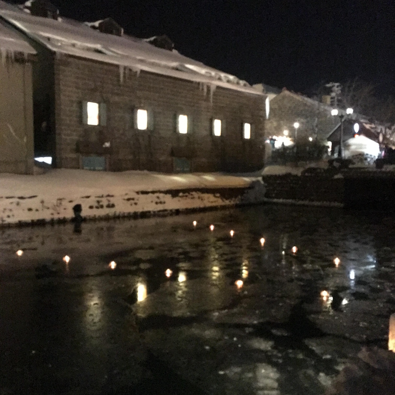 冬の北海道初心者の我々にとって雪の積もった運河沿いを歩くのはかなり至難の業でしたが、そんなことも吹っ飛ぶくらいに美しい光景でした。昼間の運河でも感動しましたが、夜の時間帯に運河沿いに作られた雪のアートとそこで燃えるキャンドルにたらされて運河がとても幻想的に見えました。一生忘れられない光景です。