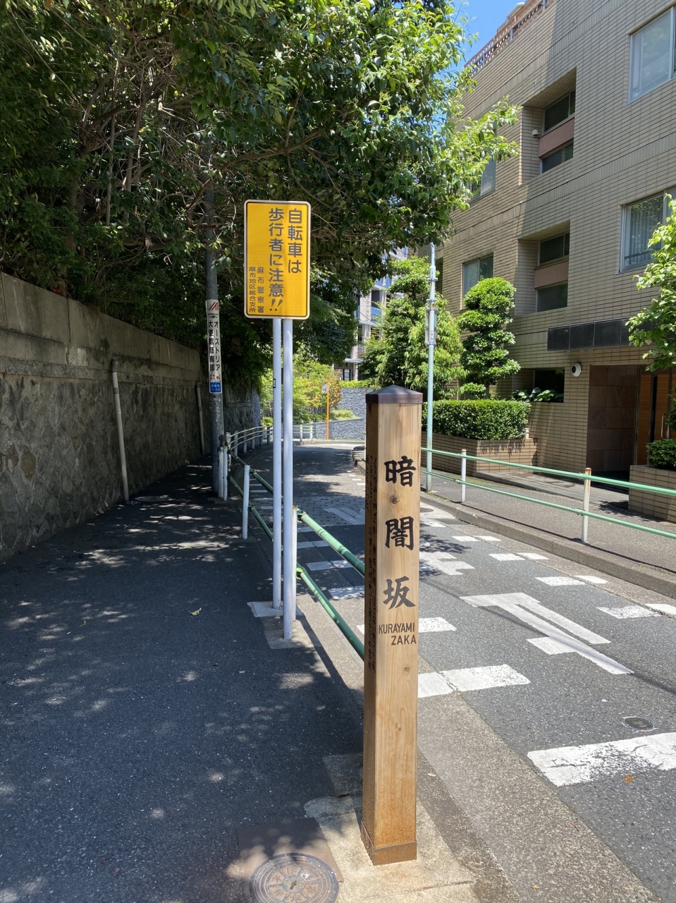 元麻布から麻布十番に抜ける際に通りました。ちなみに今回は徒歩です。坂は車道になっていて、細いながらもわりとクルマの往来が多い印象です。ただ柵付きの歩道が整備されているので安全に歩くことが出来ます。由来は樹木が暗いほど生い茂った坂であったとのこと。今では一部マンションが建っていますが、それでも道路まではみ出した木々が生い茂っており、その名残りを感じることが出来るかなと。