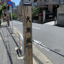 坂の多い元麻布にある坂のひとつです。坂は道路になっていて車道が整備されていますが、交通量は少なめでしたね。歩道に標識が建てられていて、そこに名前の由来が明記されています。それを読むと大黒と書きますが、大国とも書くそうです。また坂の中腹北側に港区七福神のひとつである大黒天をまつる大法寺があったためとのことが明記されていました。