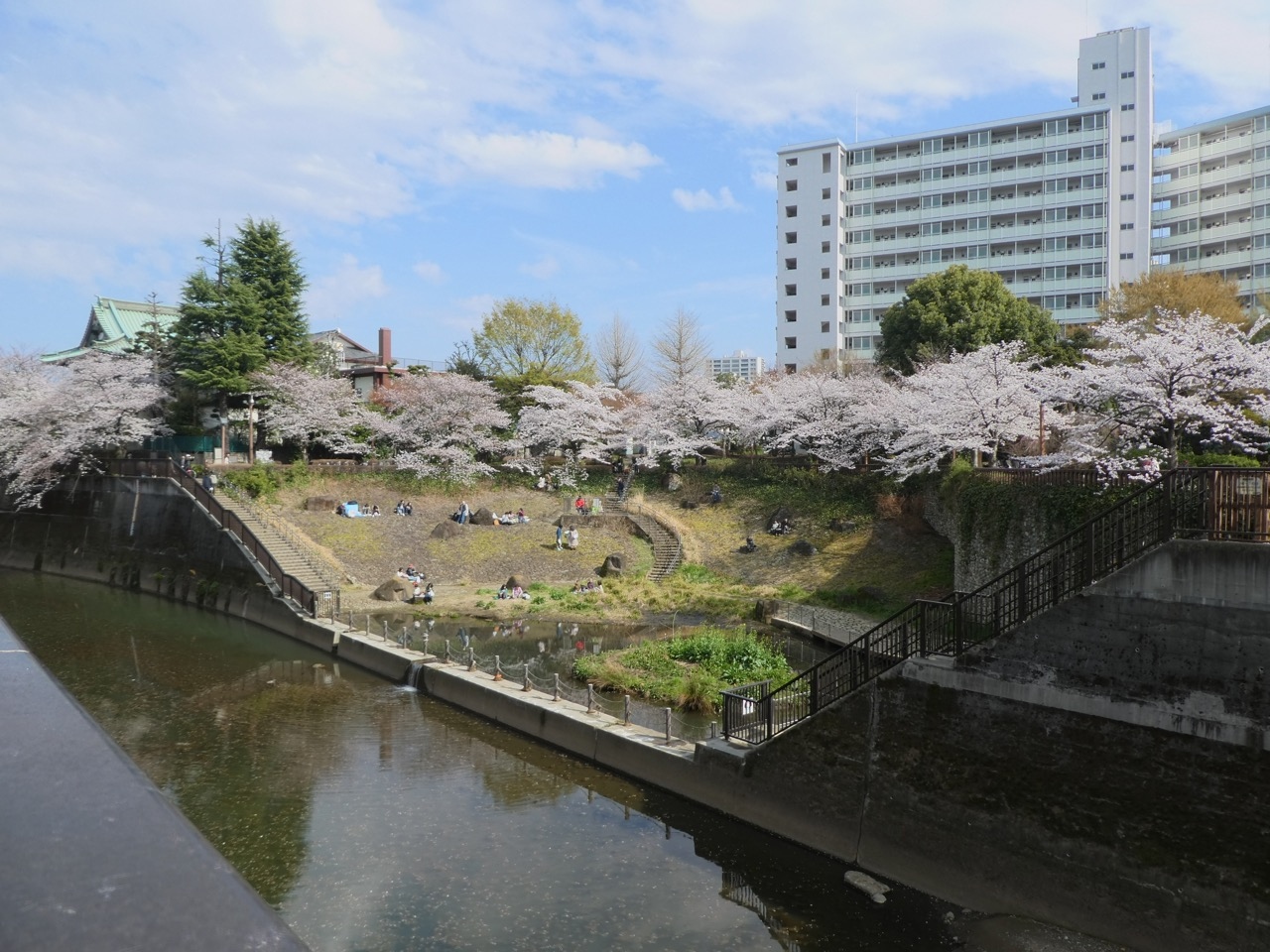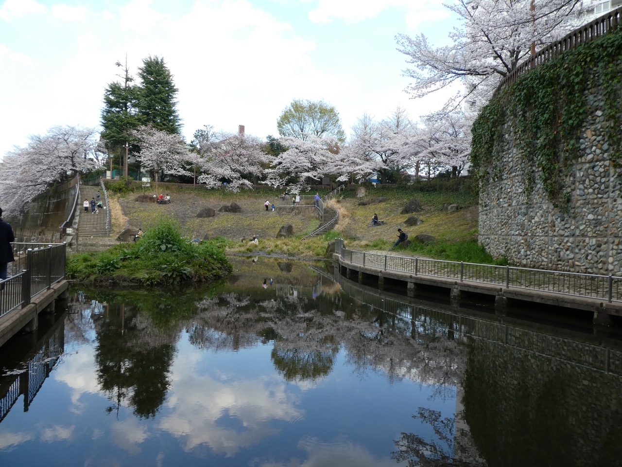 石神井川は両岸が絶壁のコンクリートで固められた都市河川ですが、ほっとする公園がありました。川面に降りられます。川面に向かってすり鉢状に緑地があり、デートの男女が間隔をあけて座って話しこんでいます。遊水池なのかな、と思います。周囲には桜があり花見にもいいです。