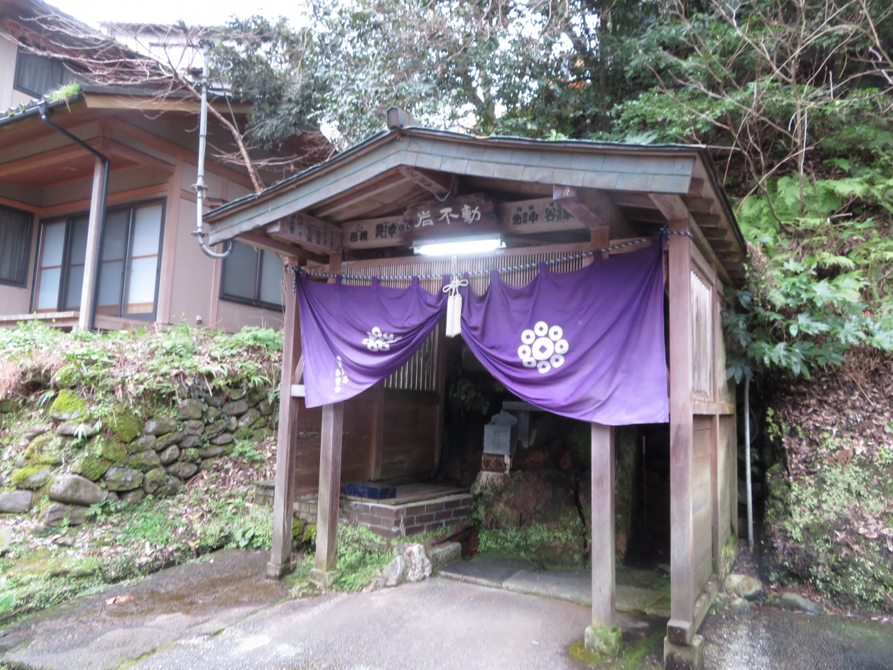 こおろぎ橋のたもとにある地蔵さまがおられる場所です。入り口に青いぬのがかかっていて、その上にちゃんと岩不動と書いてありました。この場所だけに、こおろぎ橋を渡る前に、ここでお参りしてから渡ればいいのかなと思い、お参りしました。