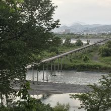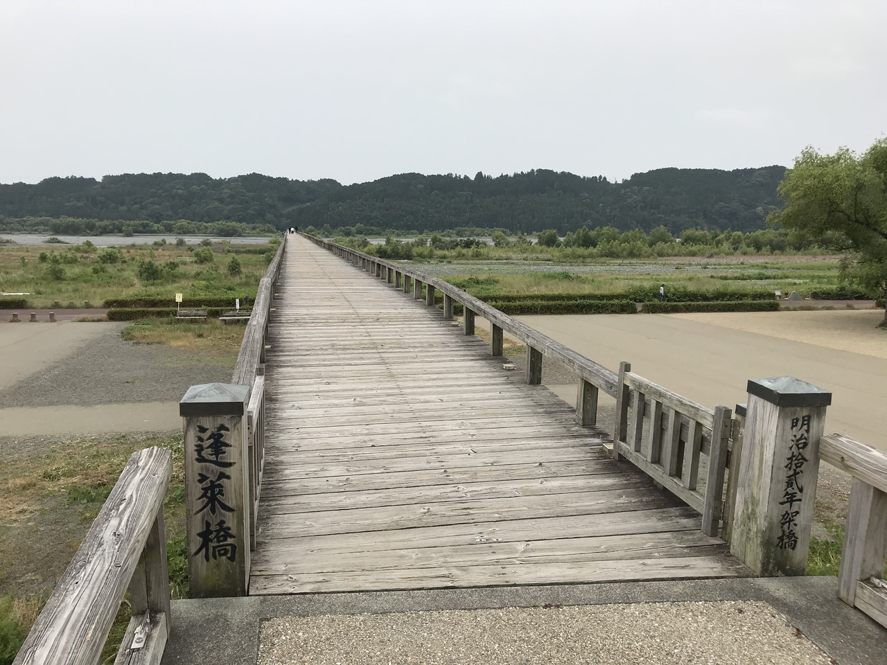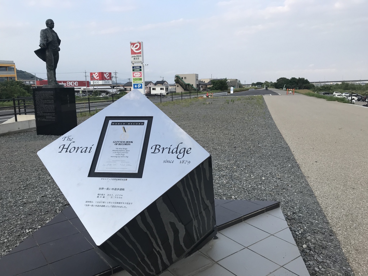 全長897.4mの世界最長の木造の橋です。往復するのとチョットした散歩で軽く汗が出ました。午後5時までは、橋のふもとの事務所で100yen支払いします。それ以降は、橋の入り口にある貯金箱に100yen 入れて入ります。事務所の窓には、昭和三十年台の蓬莱橋の写真が貼ってあります。ボロボロ、ガタガタの橋で今の橋はよく整備されています。ギネス登録のタテも事務所前方にあります