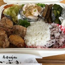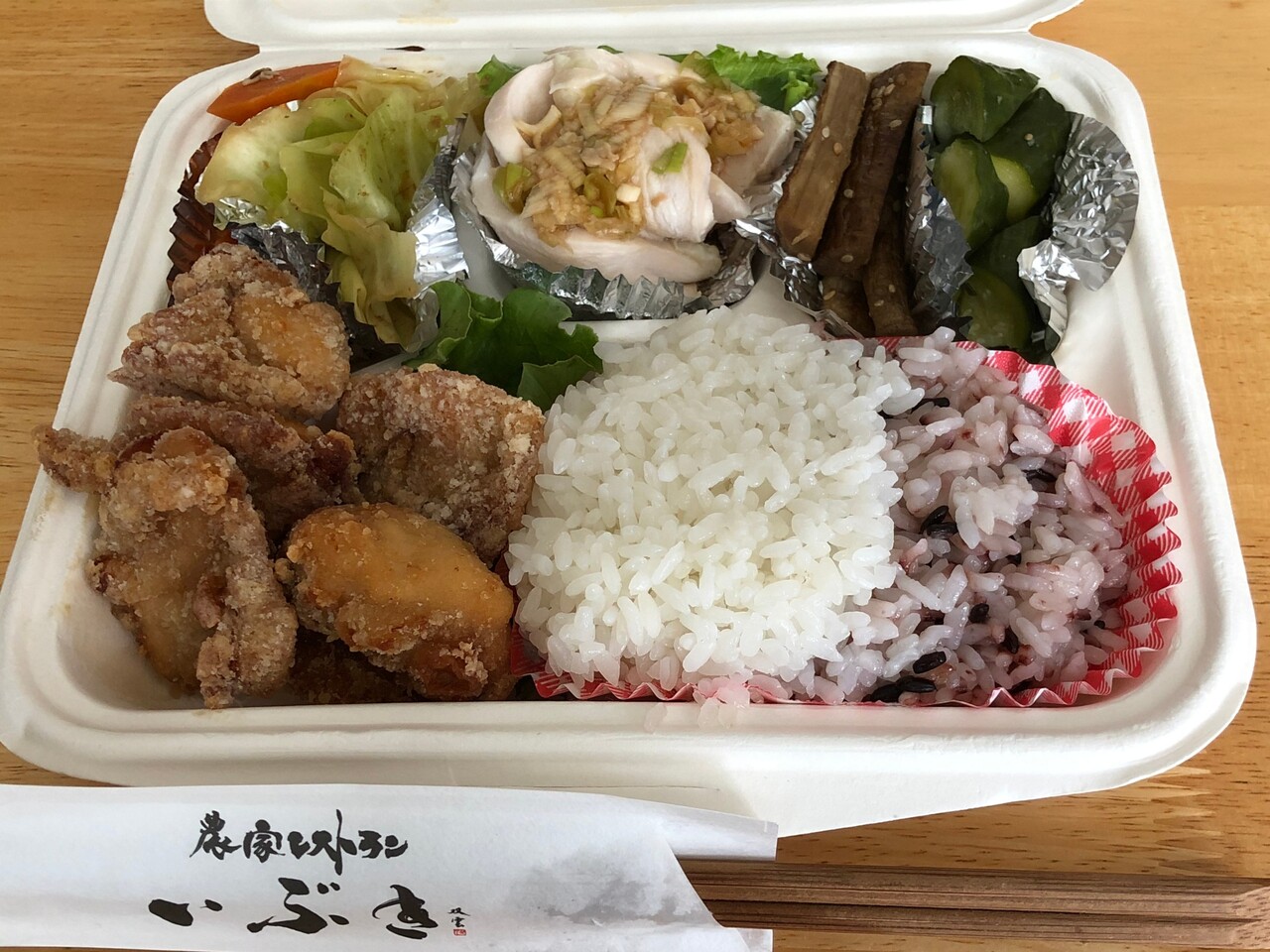 いぶき弁当980円をチョイスしました。白米と、五穀米、鳥の唐揚げ4点、鶏肉の中華ネギ醤油かけ、ゴボウの炒め物、キャベツとにんじんの炒め物とボリューム満点です!
