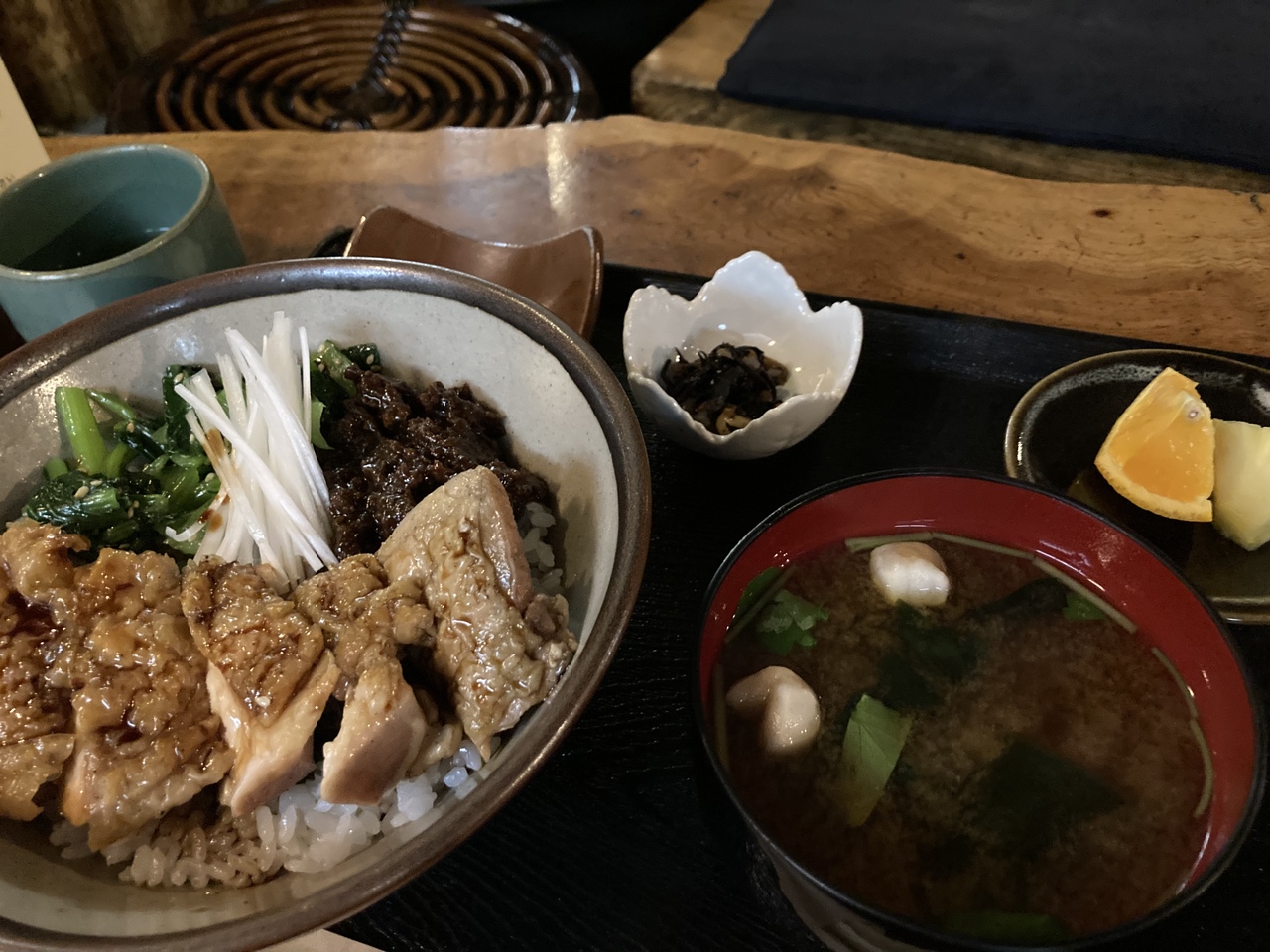 鶏ももは肉厚ジューシー。これをもりもりと頬張りながら、鶏味噌・青菜・ネギを白米と混ぜて食べる。美味い!