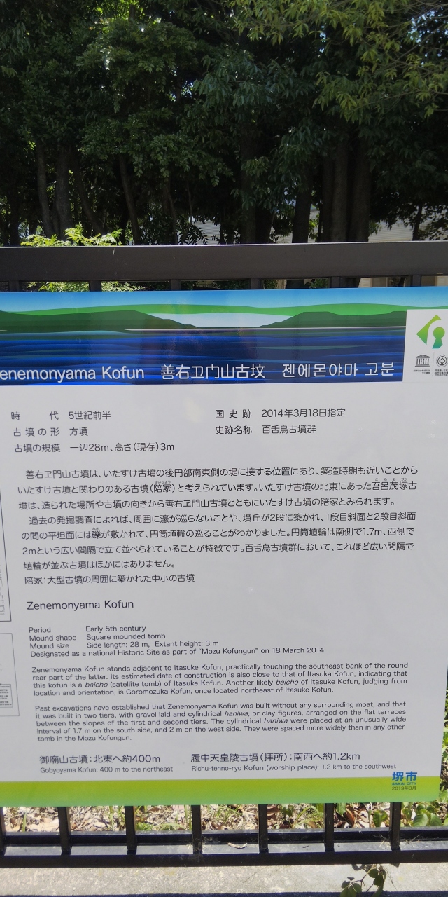 善右ヱ門古墳は世界遺産に登録された百舌鳥古市古墳群のひとつで、いたすけ古墳の陪塚古墳です。最寄りの駅はJR阪和線の百舌鳥駅で、歩いて10分かからないぐらいのところにあります。フェンスで敷地内に入れないようにしてあり、説明看板があります。