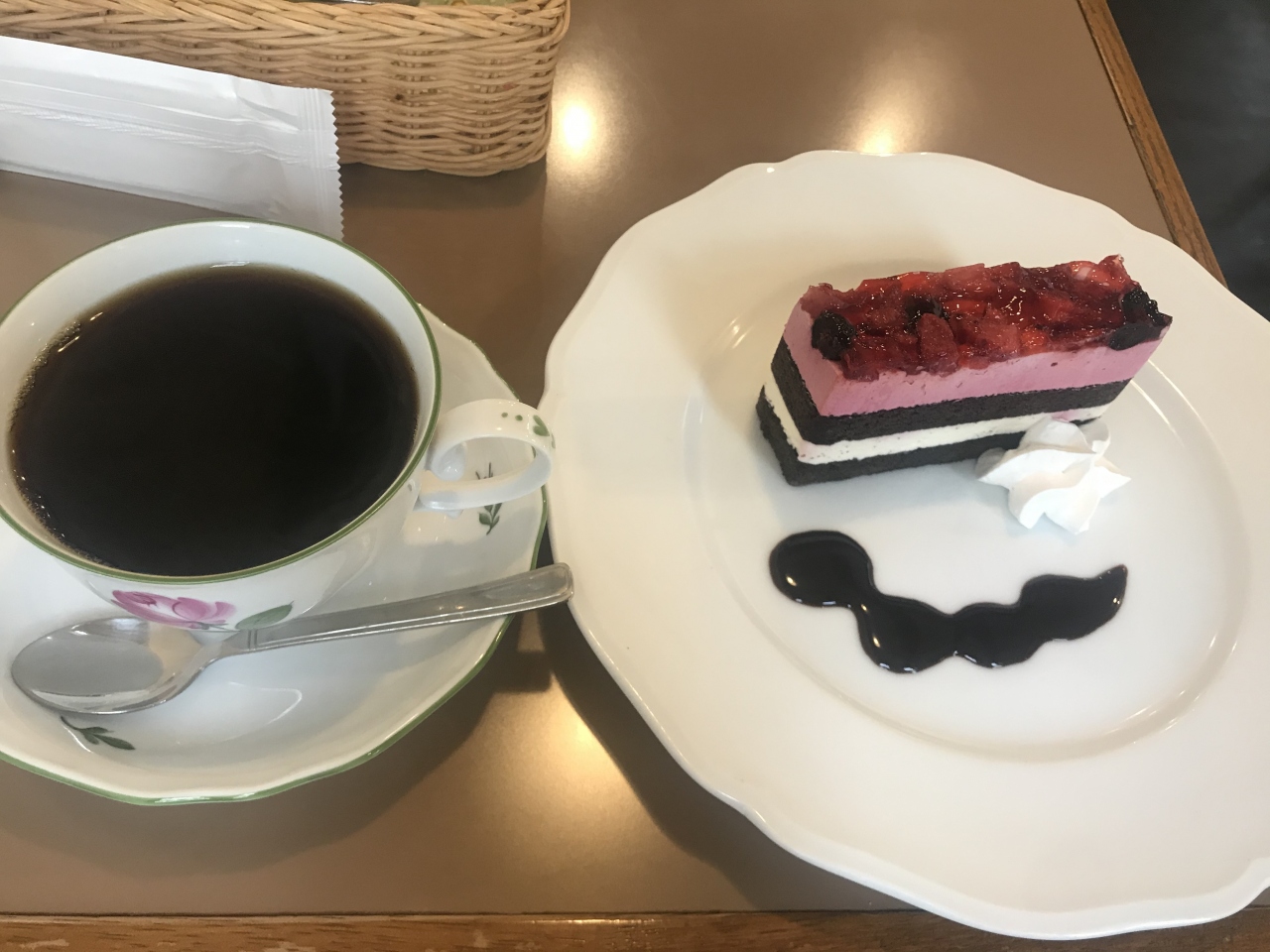 カシスのケーキとコーヒーを頼みました。ケーキを頼むとコーヒーが280円になります。