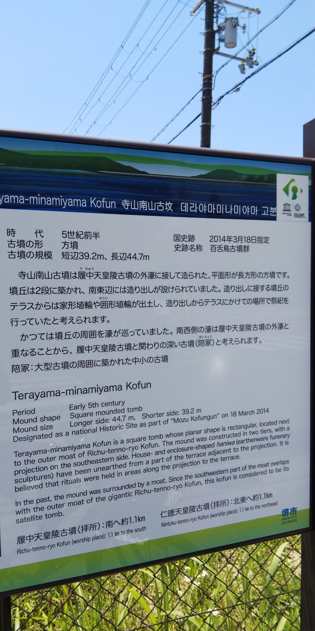 2019年夏に世界遺産に登録された百舌鳥古市の古墳群のひとつです。履中天皇陵古墳の外堀に接して造られており、陪塚だと言われています。5世紀前半に作られた方墳で、お堀はありません。説明看板があり、フェンスで囲まれています。