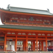平安神宮の正門です。朱色が鮮やかな二層建ての楼門でありますがことわざの由来になった門だとか。「弘法も筆の誤り」應天門の文字に点がたりなかったとか。もちろん現在の物は別の方が書いたものですが見上げて文字を見てしまいました。