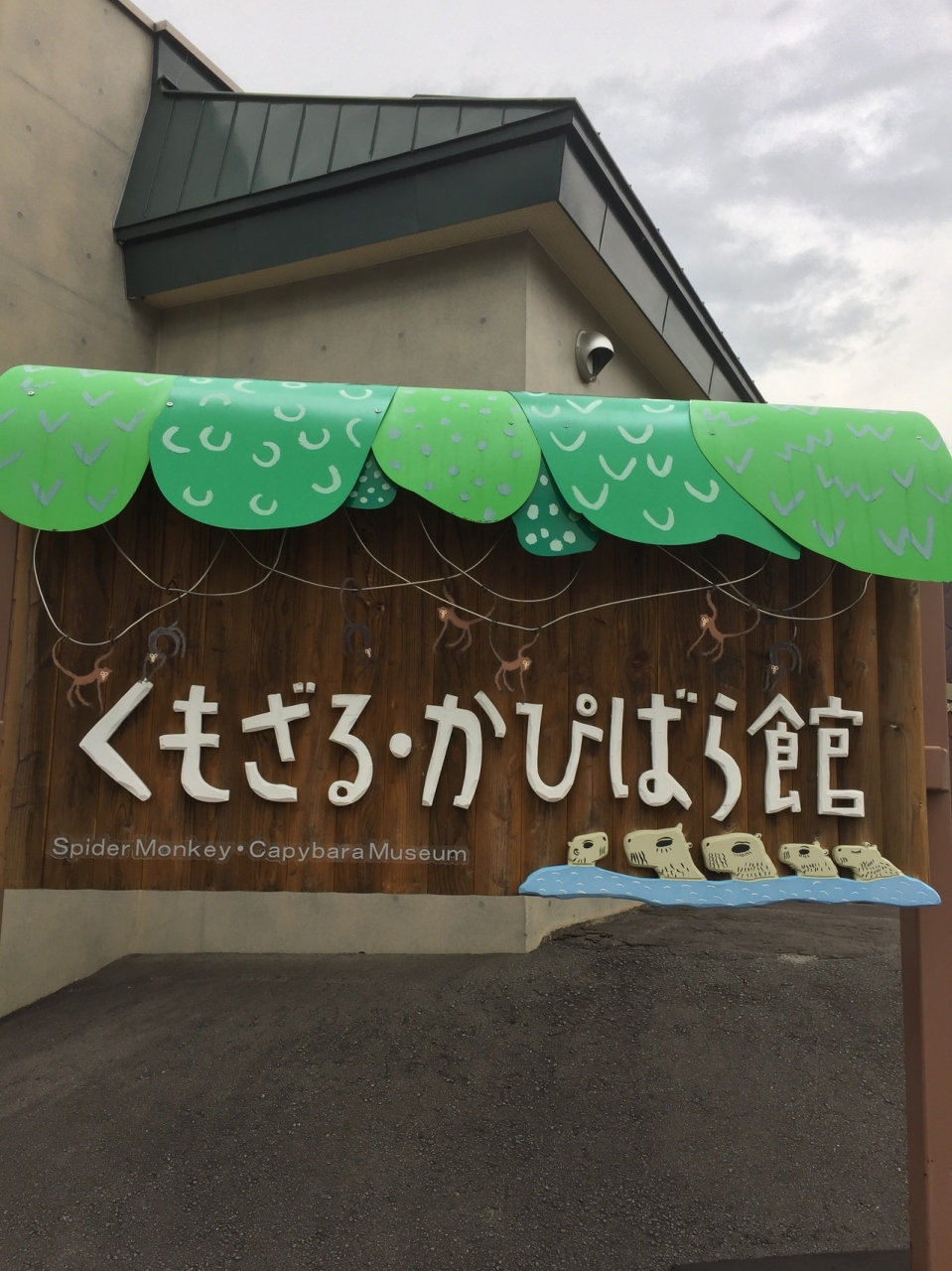 旭山動物園で、ジェフロイクモザルとカピバラが仲良く暮らしているところです。