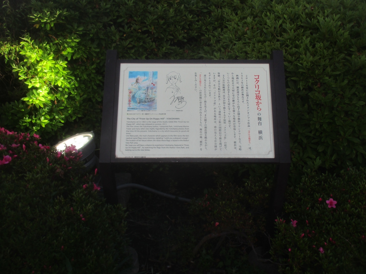 横浜を舞台にしたスタジオジブリのアニメ映画「コクリコ坂から」の記念スポットが、港の見える丘公園にありました。見晴らしの良い展望台近くに国際信号旗(U・W旗)と記念パネルが展示されていました。公園に来て展望台に寄らない人はいないでしょうから、こちらに来て映画の雰囲気を楽しむのもいいと思います。