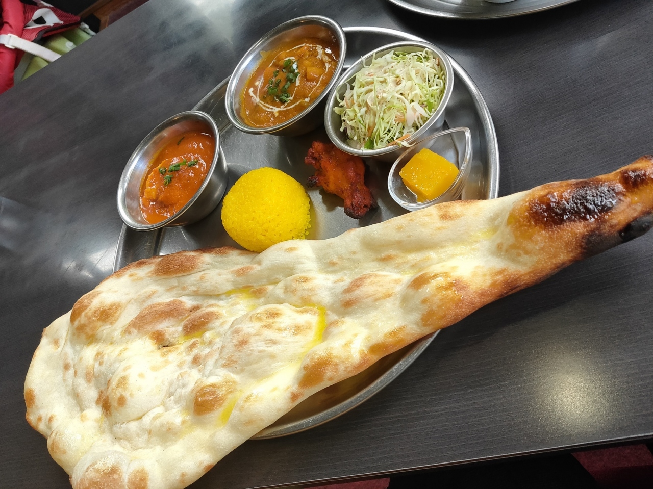 ボリューム満点!ネパールカレーのセットを注文したのですが、ドデカイナンに加えてライスも付いているので、食べきるのに苦難しました。味は美味しくこのボリューム。大満足ですが、完食には苦労しました。私的には美味しいので、ボリュームを減らしても満足出来そうです。