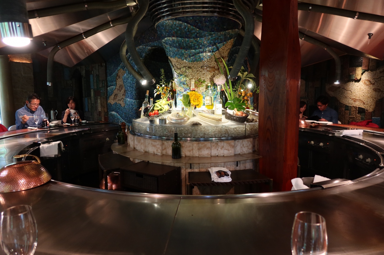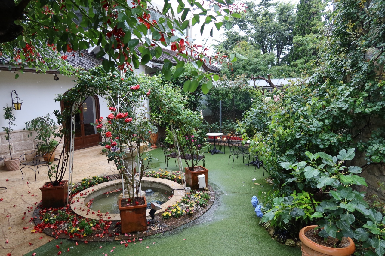 お店はお店はフランスから移築した邸宅で、館内の装飾品も高級なものがならべられています。そして庭園にはバラやアジサイの花が沢山さきとってもお洒落な雰囲気。今回通された席は大きな円形の鉄板焼きグリルのある大広間。頂いたランチコースは約1万円で、サラダ、スープ、魚料理、ステーキ、ライス、デザートが付いたました。どの料理も素材を大事にし、つい、「美味しい」と言う言葉がこぼれてしまう程の味。料理人の手捌き、会話も楽しめ、至極の時間を過ごすことができました。