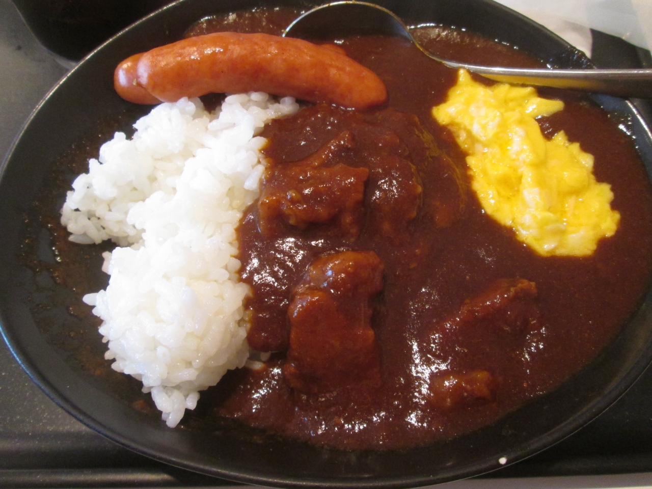 サクララウンジで朝から特製カレーが提供されるようになり、私的にポイントが高いです。贅沢な大きさでとろけるくらいにおいしいビーフが惜しみなく入っています。本場ドイツに負けない歯ごたえのあるソーセージにちょうど良い具合の半熟スクランブルエッグをトッピングするとさらにおいしくなりました。