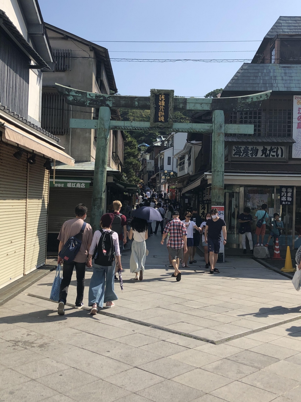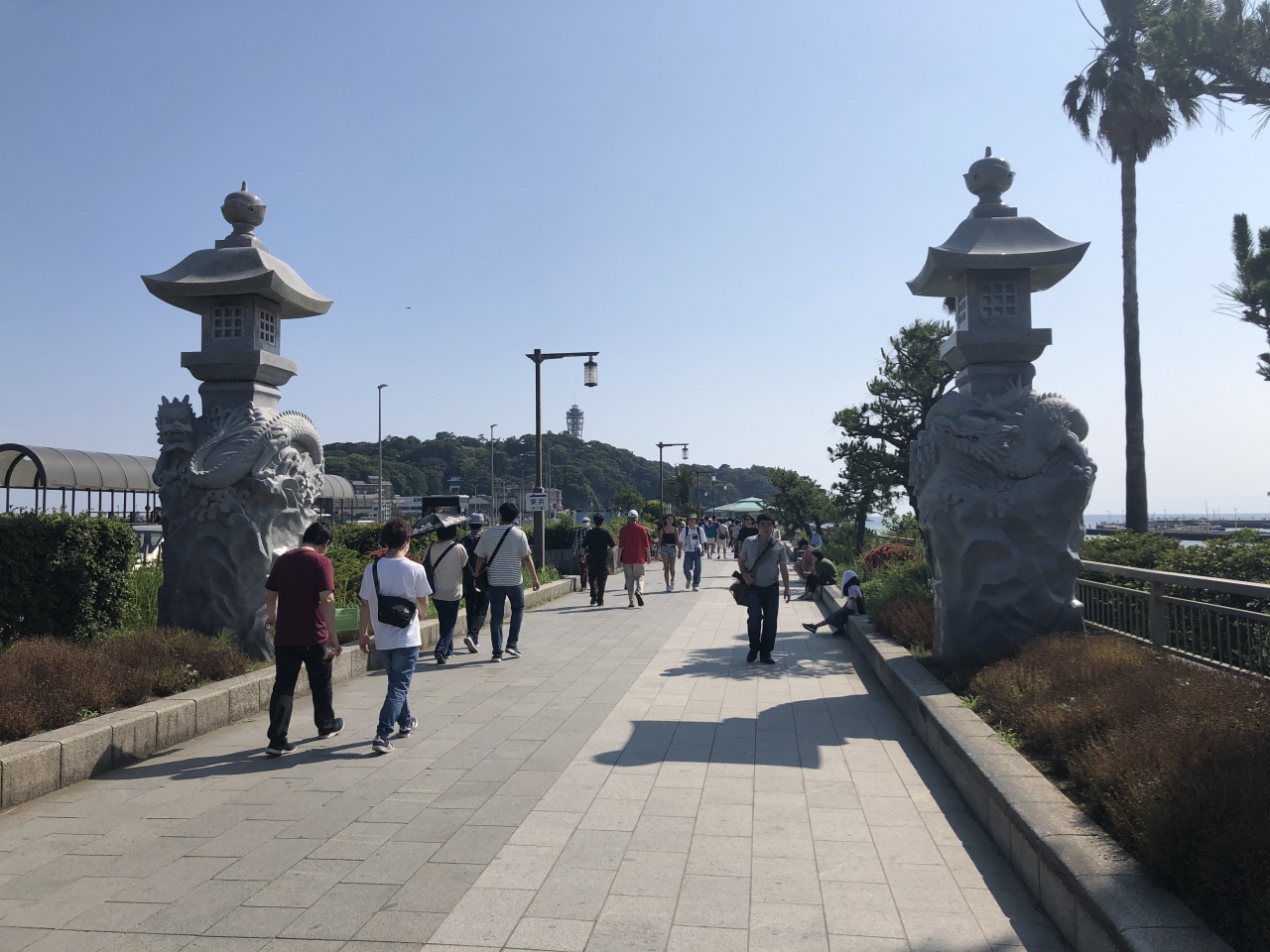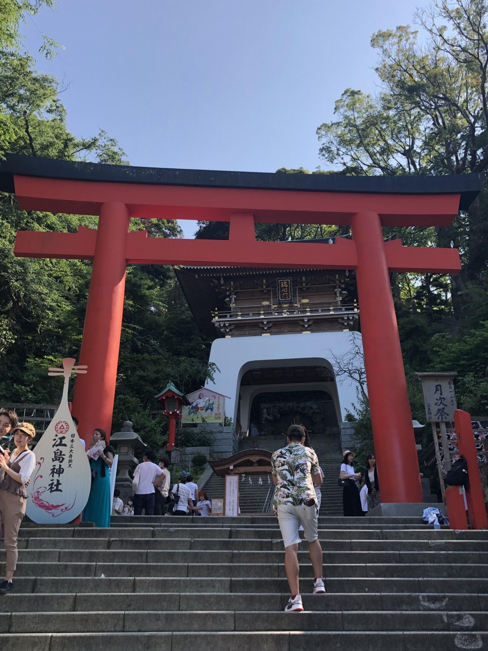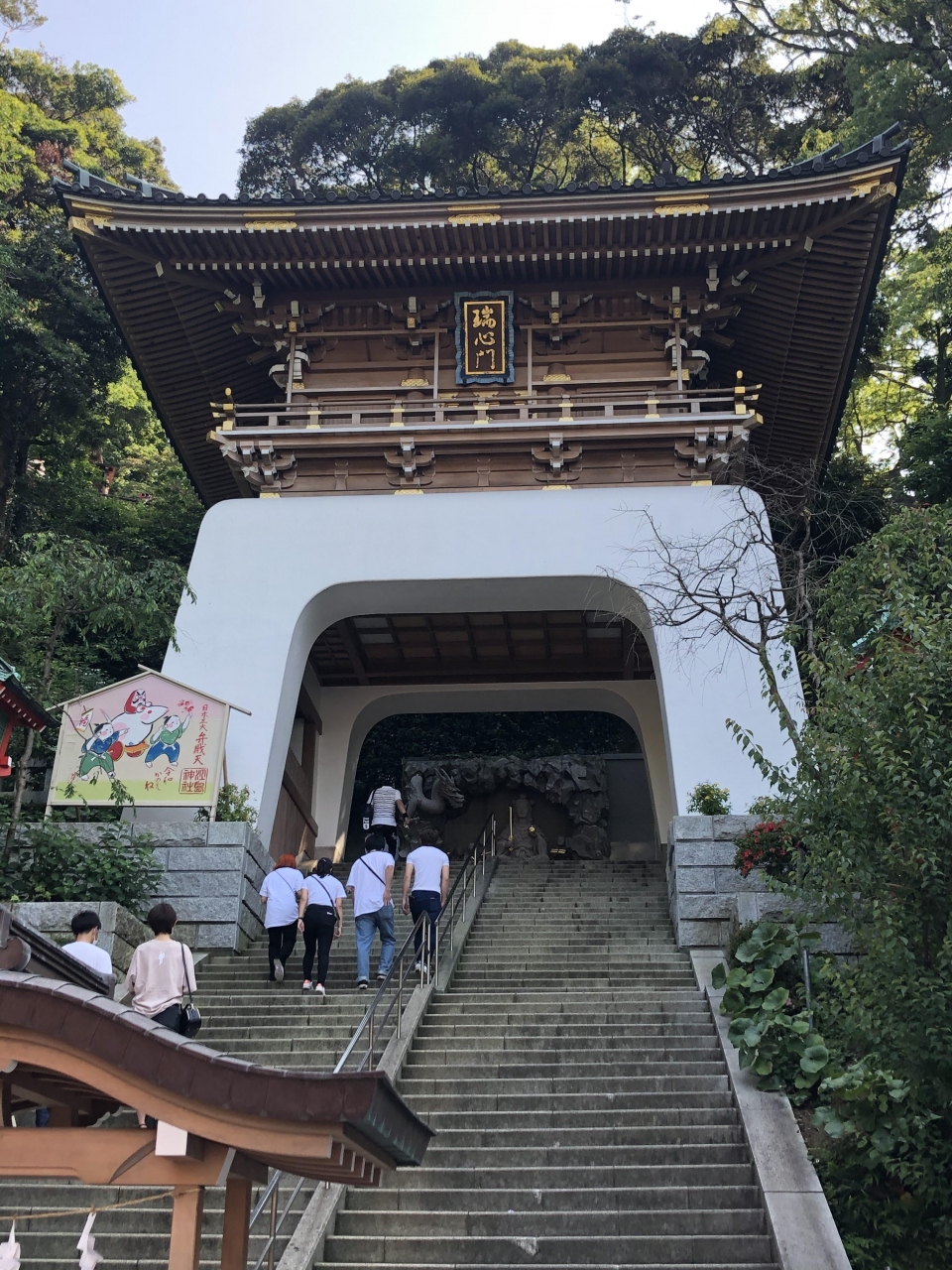 鎌倉駅から徒歩で江の島まで散策した。江の島大橋を渡って赤い鳥居をくぐり、瑞心門をくぐると江島神社辺津宮が見える。階段を5分ほど登ると江島神社中津宮の社殿に入る。朱色の社殿が印象的だ。更に5分ほど登ると江島神社奥津宮に到着する。島内にある辺津宮・中津宮・奥津宮の三社を総称して江島神社と呼び、それぞれの宮には守護神である女神が祀られている。交通安全、豊魚、豊作の他、幸福、財宝を招き、芸道上達の神様として多くの人かが訪れる神社だ。