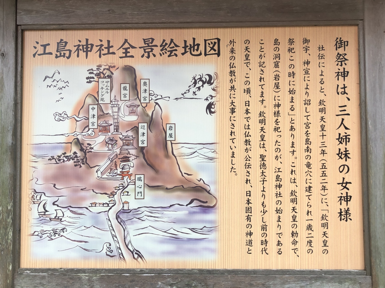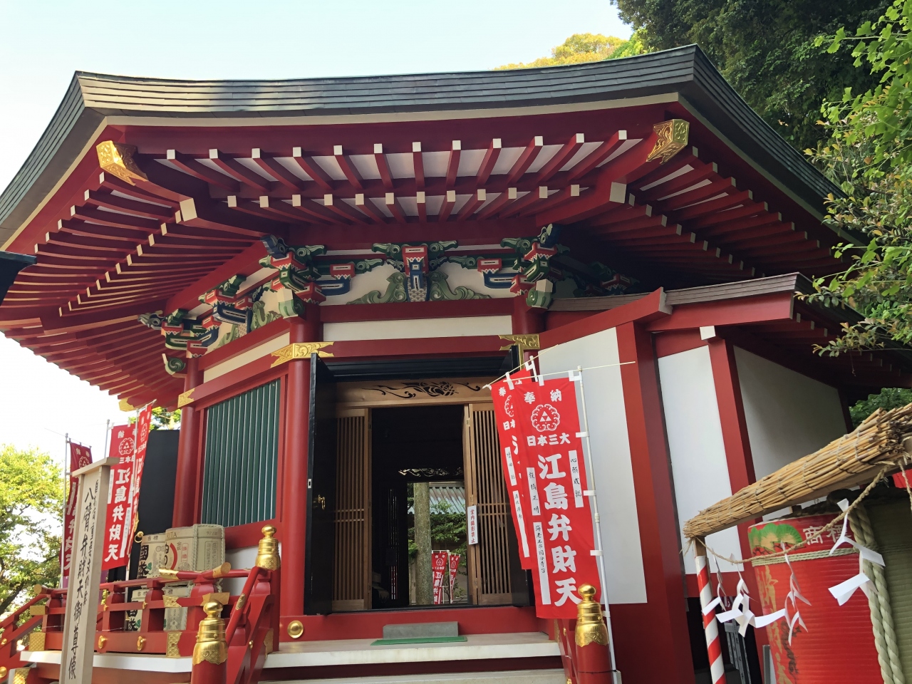 江島神社は江の島大橋を渡って赤い鳥居、瑞心門を経て小高い丘の上ある