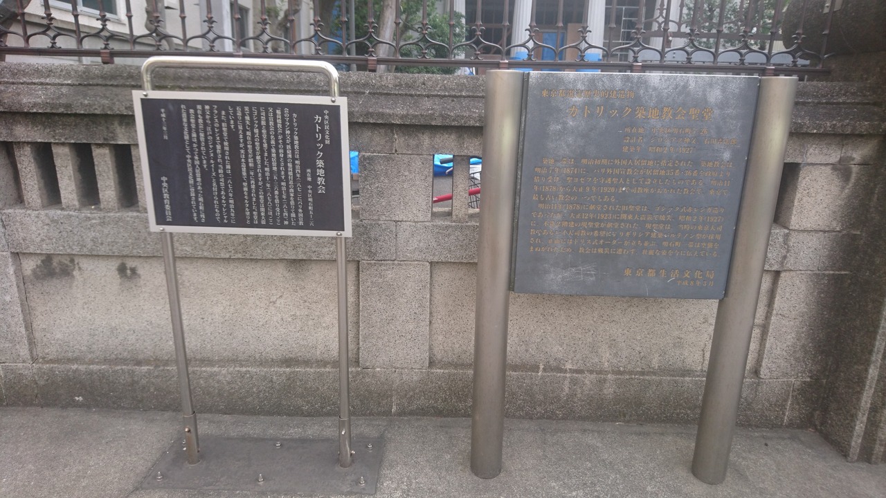 聖路加国際病院の北側にカトリック築地教会がありました。1871年に鉄砲洲に開かれたのちに、築地居留地に移転してきたそうです。外国人居留地らしい建物ですので、当時をしのぶことができました。築地市場とはまた違った意味での築地を感じることができました。