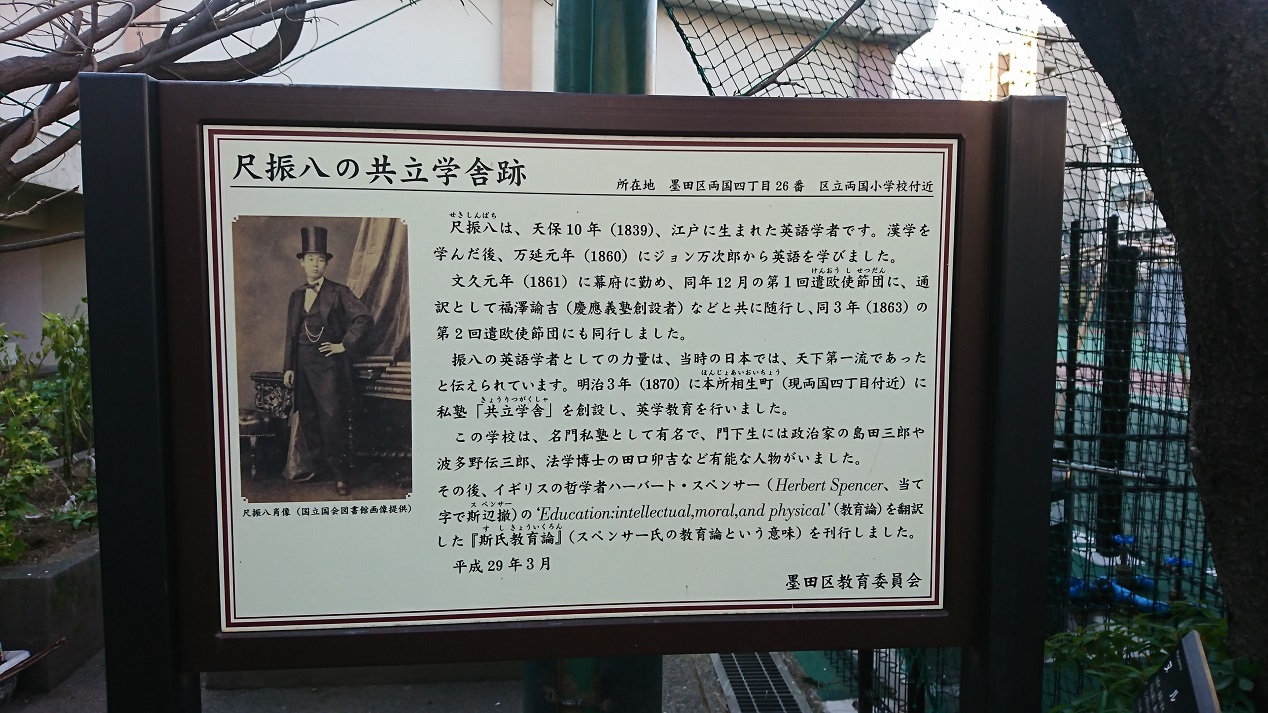 墨田区両国4丁目の路上に尺振八の共立学舎跡の説明板が立っています。尺振八が明治3年(1870年)に創設した私塾【共立学舎】のあった場所です。ヨーロッパやアメリカに行き、西洋文明に接した経験があった人物で、現代英学の祖父と呼ばれた人物なのだそうです。