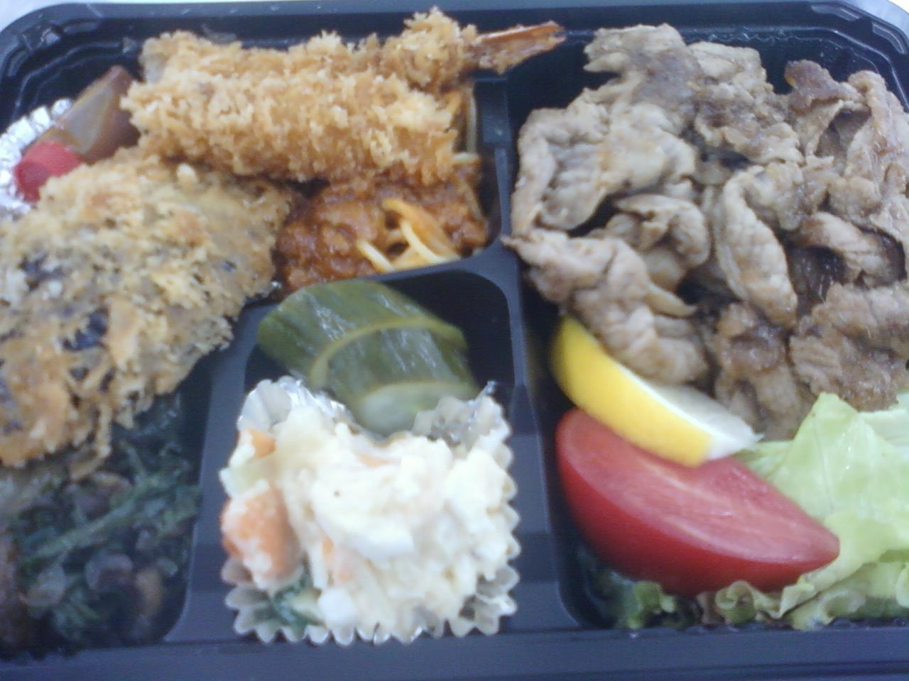 ここのでめきんさんは、小田急線相模大野駅からすぐのところにある、大野銀座という商店街沿いにあるお店です。ただ、メインの通りではなく、駅から来ると少し右手に曲がった路地にあるので、知る人ぞ知る、という感じのお店です。美食と書いてあったように、お弁当を注文してみると内容の充実ぶりにびっくりです。お弁当箱一箱におかずがぎっしり入っていて、ご飯はさらに別のパックでたっぷりついてきます。しょうが焼き弁当ですが、エビフライやパスタも入っていて、とてもおいしくいただきました。