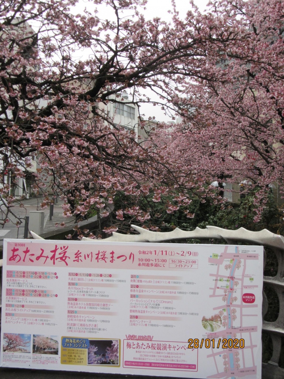 1月末の平日、熱海の古い繁華街で海岸に向かう途中の糸川沿いに綺麗に桜が咲いていました。1月11日~2月9日まで桜まつり開催中で、16時30分~23時までライトアップされ、またイベントが川沿いで2月に4回催されるようでした。有名な河津迄行くのは大変ですが、規模こそ違いますが、ここ糸川沿いでも美しい【日本一早い桜】を楽しめました。