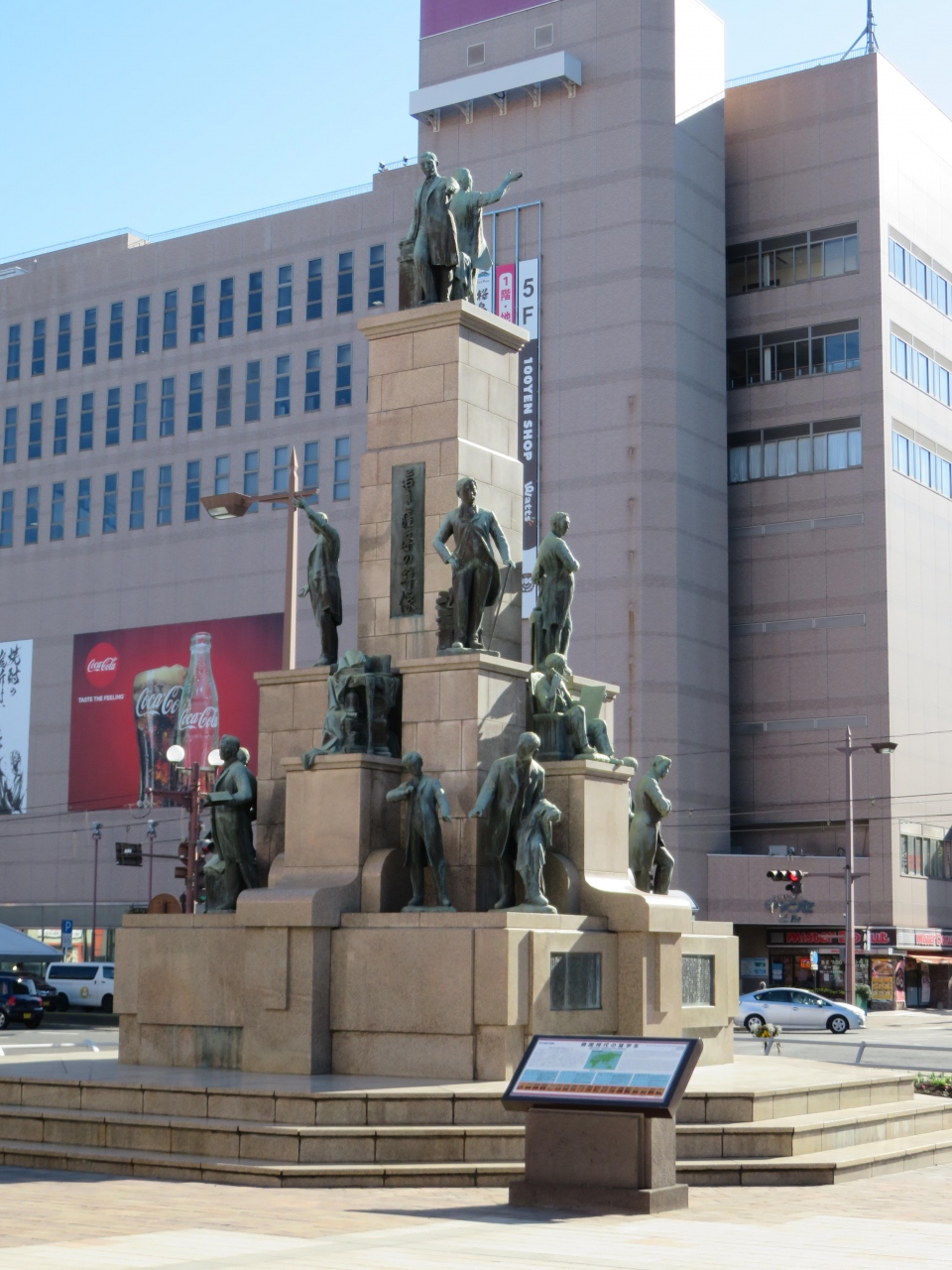 鹿児島中央駅バス停の近くにある、1865年の鎖国時代に薩摩藩が密かに派遣した英国留学生の生徒たちの像です。躍動感のある17体の像が四方に聳え立っている姿はとても目立ちます。昭和57年に建立されたんだそうです。