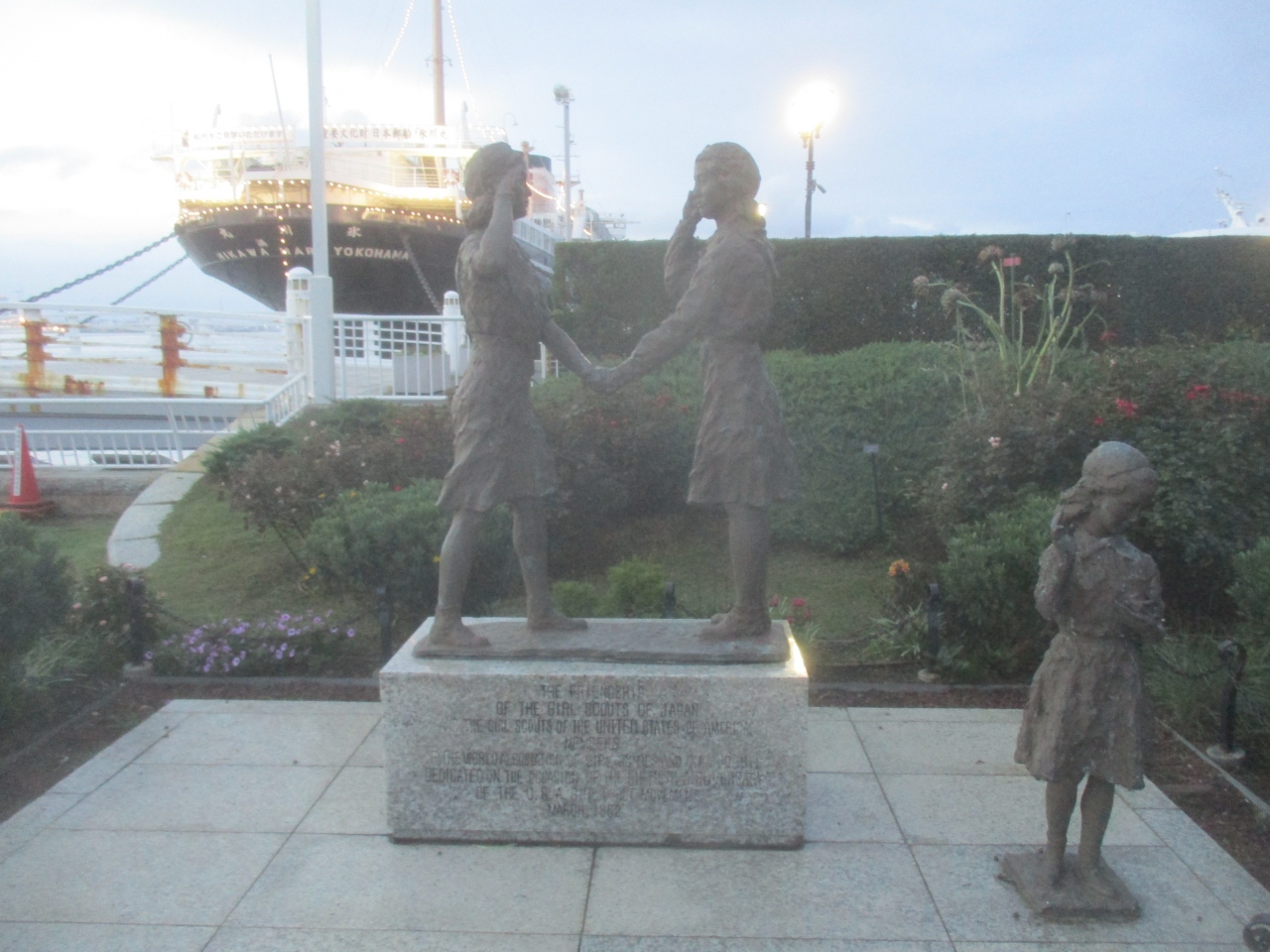 山下公園にある像のひとつです。公園内にいくつかの像がありますが、氷川丸の前なので分かりやすいと思います。握手をする少女の銅像で、アメリカガールスカウト50周年とガールスカウト日本連盟の世界連盟加入を記念したものだそうです。ガールスカウトの募金で1962年3月に建てられたものです。