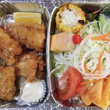 昼に予約した時に、ご飯は要らないんですねと念を押されたのですが、確かにお弁当として詰め合わせることが出来るアルミ容器に入っていました。おまけに揚げたての熱々です! 予想以上の肉厚で、付いているタルタルも良し、塩であっさり頂いても良しでした。高齢の母も大満足でした。