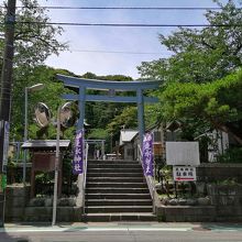 こじんまりした神社ですが、眺めがよく上にあがると対岸の千葉まで見えます。参道から見える海もきれいです。