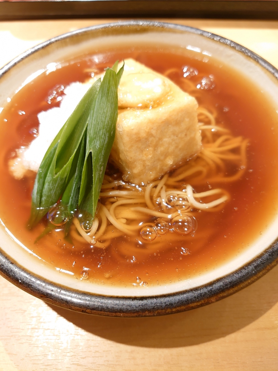 久しぶりに訪れたのですが、店の裏にも駐車場があり、店の隣の土地も駐車場になっており駐車場をかなり広くとってありました。武蔵そばを注文しました。豆腐の中に柚子胡椒を入れて揚げてある。汁はとろみのあるお蕎麦。品のあるお味でした。
