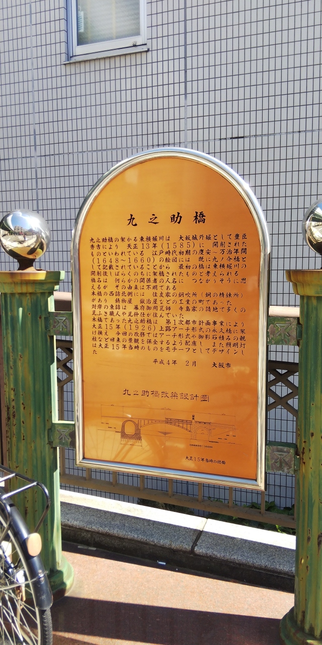ヒトの名前が由来っぽい橋名ですが、定かではないらしい。東横堀川自体は、大阪城の外堀として、豊臣秀吉の頃の1585年に開削されました。江戸時代初期の1648年~1660年頃に描かれた絵図には、九之助橋は登場していました。歴史が長い橋で、現在のものは大正時代にかけ変えられたものです。