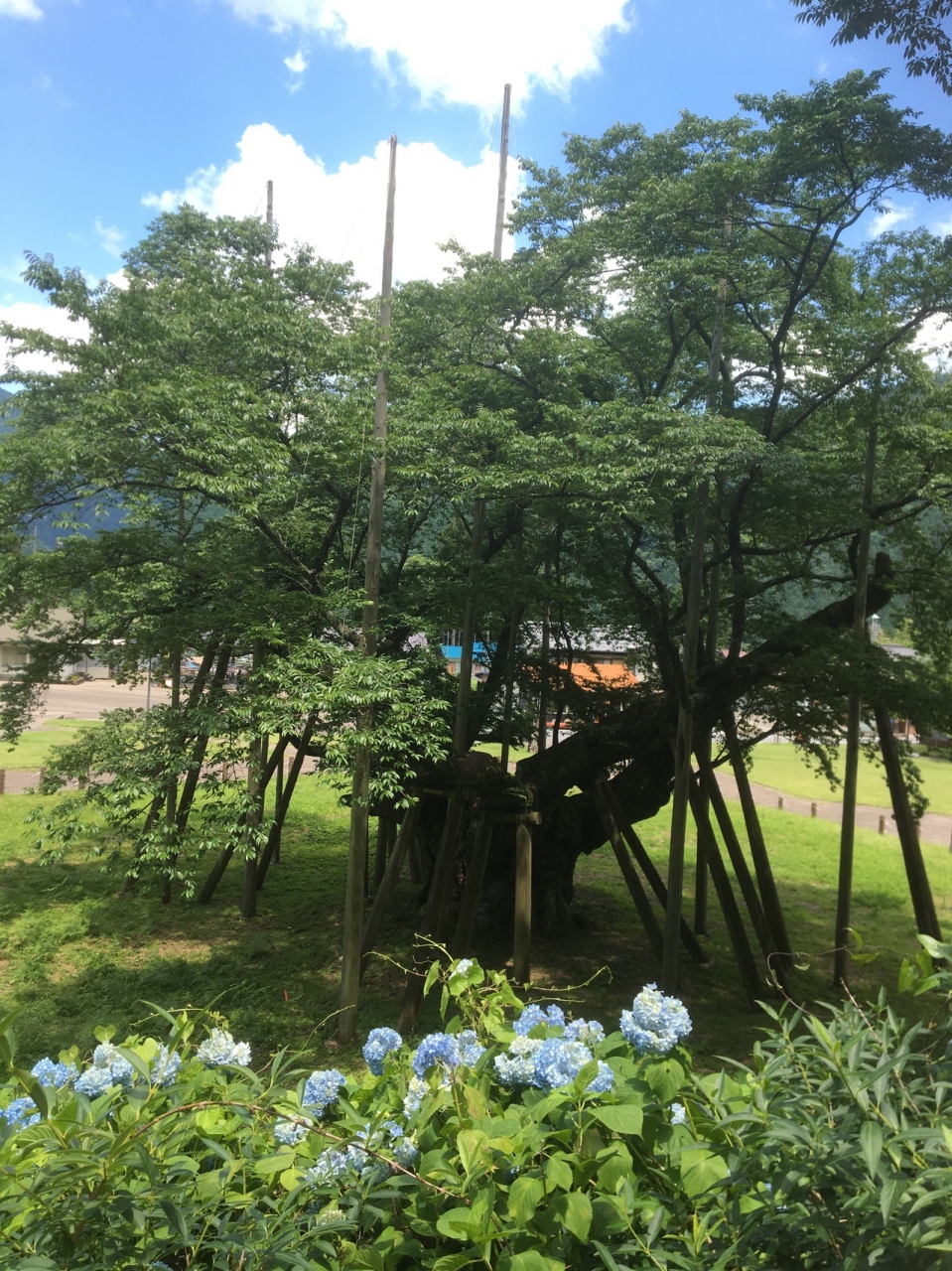 桜の周辺が広大な公園として整備されています。開花時期は丘の下からの道路は通過できないようですが、開花時期以外は近くの駐車場まで車で入ることができました。広大な公園に人も少なく、小さい子供連れが楽しんでいました。桜の山側にあじさいもあり、あじさいと葉桜が楽しめました。