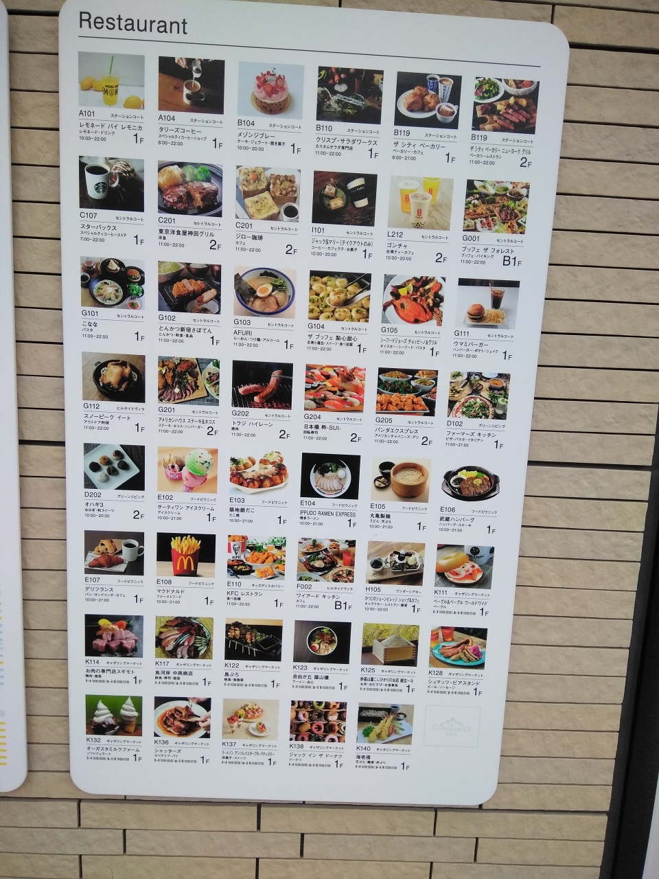 食事処は60店舗位あります。アウトレットの店もあります。施設に隣接してグランドや**広場があり休日は混雑しそうです。駐車場はかなりありますが有料で、お買い物等をすると一定時間無料になりますが、駅にちかいので電車を利用したほうがゆっくり出来ると思います。営業時間は11:00~20:00です。