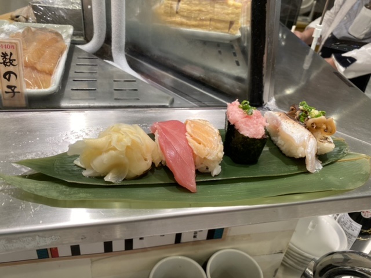 食べたのは平日限定5貫セット550円(天然まぐろ、トロサーモン、ねぎとろ軍艦、あぶり鯛、ゲソ)に穴子2貫!