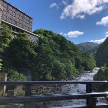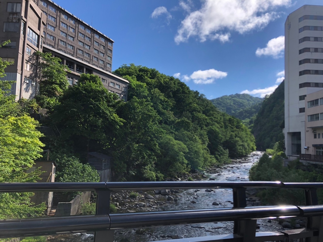 定山渓温泉街にあります。豊平川に架かる橋です。橋からは豊平川の渓谷が一望でき、景色が綺麗でした。紅葉の時期はさらに色彩豊かな景色が見られるようです。橋の途中には定山渓温泉のマスコットのかっぱの像があり、写真撮影している人が多かったです。