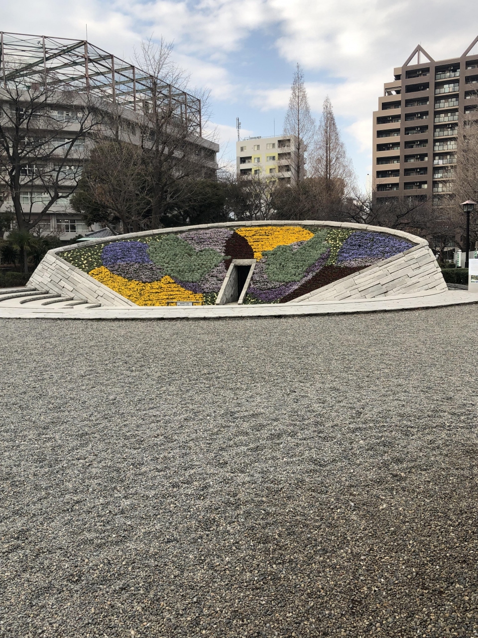 両国駅から少し歩いたところにある横綱町公園にあります。公園内には第2次世界大戦の東京大空襲の犠牲者を追悼した慰霊堂がありますが、すぐその近くにこちらの記念碑があります。説明を見るまでは、半円形状のきれいな花壇だと思いましたが、東京大空襲を風化させずに平和を祈る記念碑として建てられたそうです。
