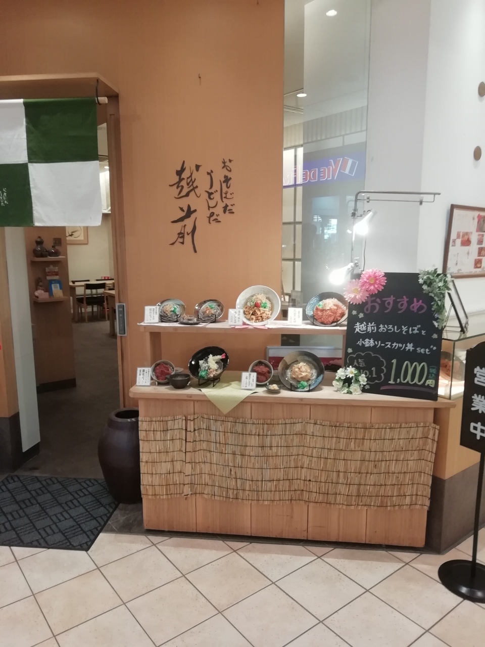 JR福井駅の改札口正面にあるプリズム福井内の一番奥にあります。少しふざけた感じの店名ですが、手軽に食事をすることが出来ます。オススメは、福井名物のソースかつ丼と越前そば。お高い専門店に比べれば劣りますが、食べそびれた方にはオススメ。リーズナブルに雰囲気を満喫出来ます、是非。