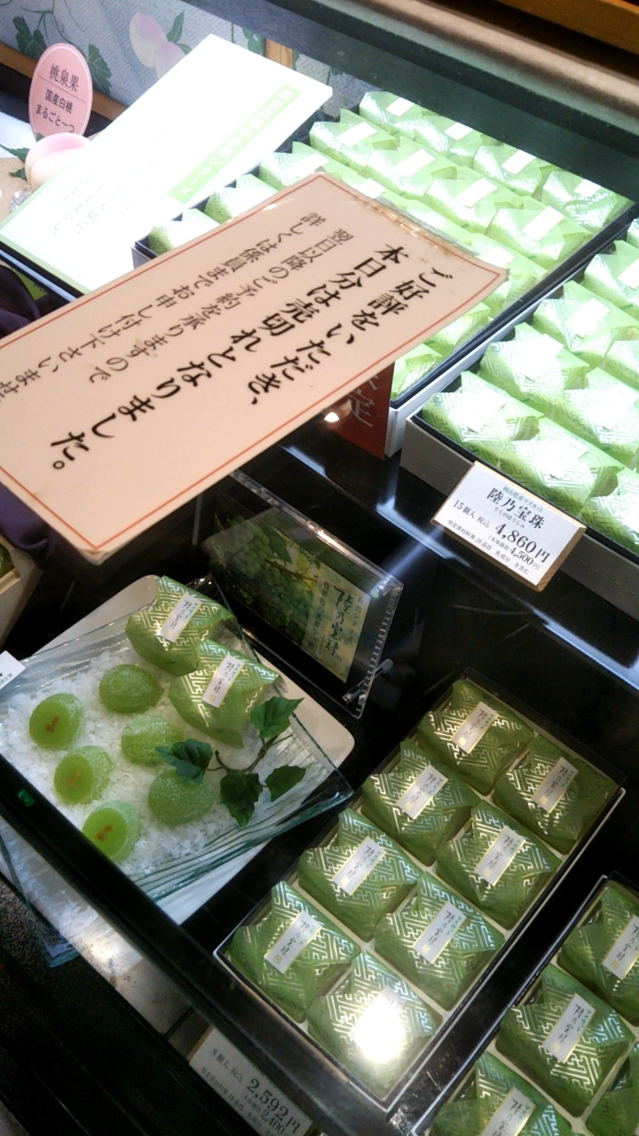 「日本橋三越本店」にある『源吉兆庵 日本橋三越店』は、岡山県の和菓子のお店です。主に岡山県産の旬のフルーツを使用した和菓子が人気です。数量限定で販売される岡山県産マスカット オブ アレキサンドリアをまるごとひとつ使用した「陸乃宝珠」が特に人気です。お高めのお菓子なのですが、早々と「本日分売り切れ」となっていました。