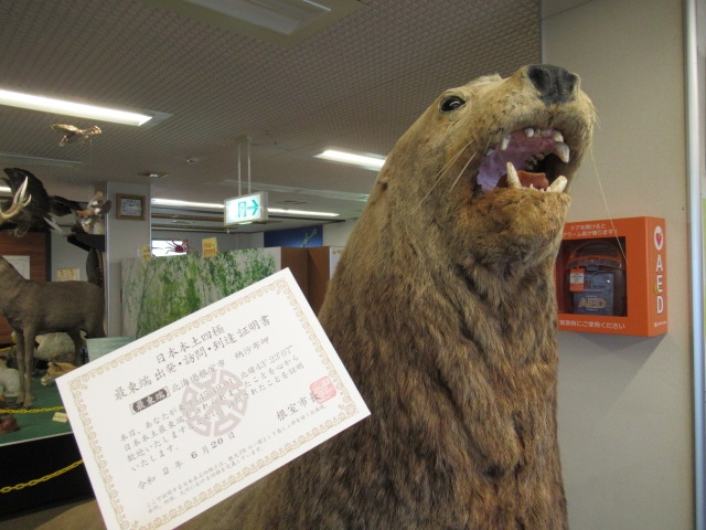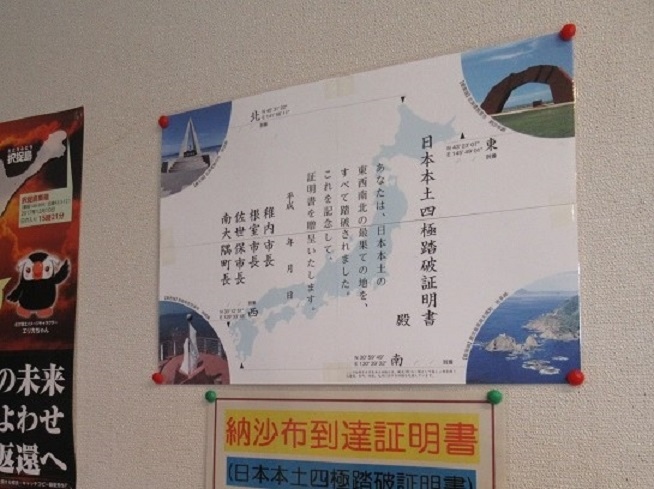 駐車場に車を止め納沙布岬付近を散歩しここ「北方領土資料館」を訪れました。入館無料で北方領土ジオラマコーナーやシアタールームなどがあり「北方領土は日本の領土である」ことをあらためて知ることとができました。その中で嬉しいことがひとつありましたので紹介します。無料で「最東端訪問証明書」を発行してくれます。根室市長印が入ったものです。日本本土の四端を集めると壁に貼られた写真のようになります。うん~行きたくなっちゃうわ。レンタサイクルを使用し周辺をサイクルするのもいいでしょうね。